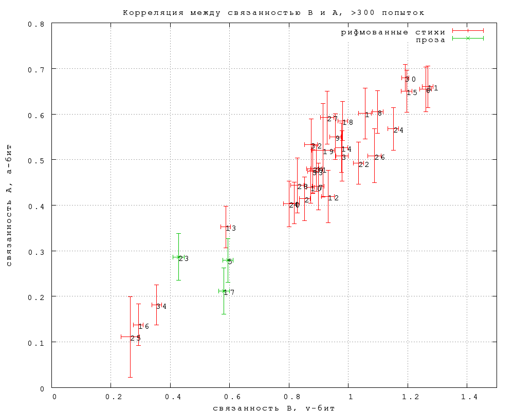 Таблица результативности игроков показывает, что опыт в игре систематически влияет на результативность. Вероятно, сказывается и то, что игра интереснее тем, кто лучше чувствует тексты, и то, что накапливается опыт в отгадывании именно тех текстов и авторов, которые включены в игру. Соответственно, результаты зависят от того, брать ли все попытки или только принадлежащие более опытным игрокам. Следующий график изображает эту зависимость. Цифры отмечают точки, рассчитанные по всем попыткам. Красные и зеленые хвосты проведены от них через точки, рассчитанные по подмножеству попыток, принадлежащих игрокам, сделавшим более N попыток, при изменении N от 1 до 300 (т.е. все более опытным). Отличаются они тем, что красные рассчитаны по всем попыткам, сделанным этими игроками, а при рассчете зеленых дополнительно отброшены попытки, в которых игрокам с опытностью >N предъявлялись замены, сделанные менее опытными игроками.Красные хвосты показывают, что более опытные игроки лучше угадывают и лучше определяют замены, практически независимо от категории текстов. Зеленые хвосты проходят ниже красных, поскольку у опытных игроков и замены более правдоподобные, т.е. их труднее отличить от авторских слов, и связанность, рассчитанная по ним, оказывается несколько ниже. Для некоторых категорий этот эффект оказывается незначительным (зеленый и красный хвосты почти совпадают), для других он преобладает (зеленый хвост идет не вверх, а вниз), но неясно, насколько этот результат статистически значим.