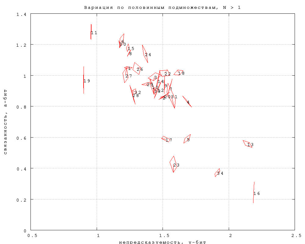 83) Любопытно (но не очень достоверно статистически), что вся разница между непредсказуемостью трех изучавшихся прозаических текстов оказывается за счет разной метрической непредсказуемости -- неметрическая часть у них одинаковая. Мы будем пользоваться сходными методами и в дальнейшем, изучая другие отдельные аспекты выбора слов.Фиг. 30