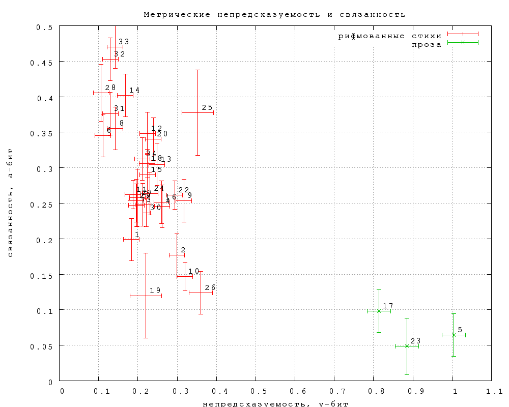 Фиг. 28 показывает распределение этих двух величин для первого этапа. Для прозы метрическая непредсказуемость значительно выше, чем для стихов, преимущественно силлаботонических рифмованных в этом этапе. Метрическая связанность прозы близка к нулю, но значимо выше у стихов. Эта картина вполне согласуется с интуицией. Самая высокая метрическая связанность у поэзии XVIII века и переводов Шекспира (а также почему-то у Ахмадулиной). Самая низкая -- у любительских стихов ("тосты и поздравления", стихи.ру, "Самиздат"), а также у текстов песен Щербакова, которые часто полиметричны. Отдельно стоящая точка 25 -- это "Шитверочестия" С.Шпикуна.