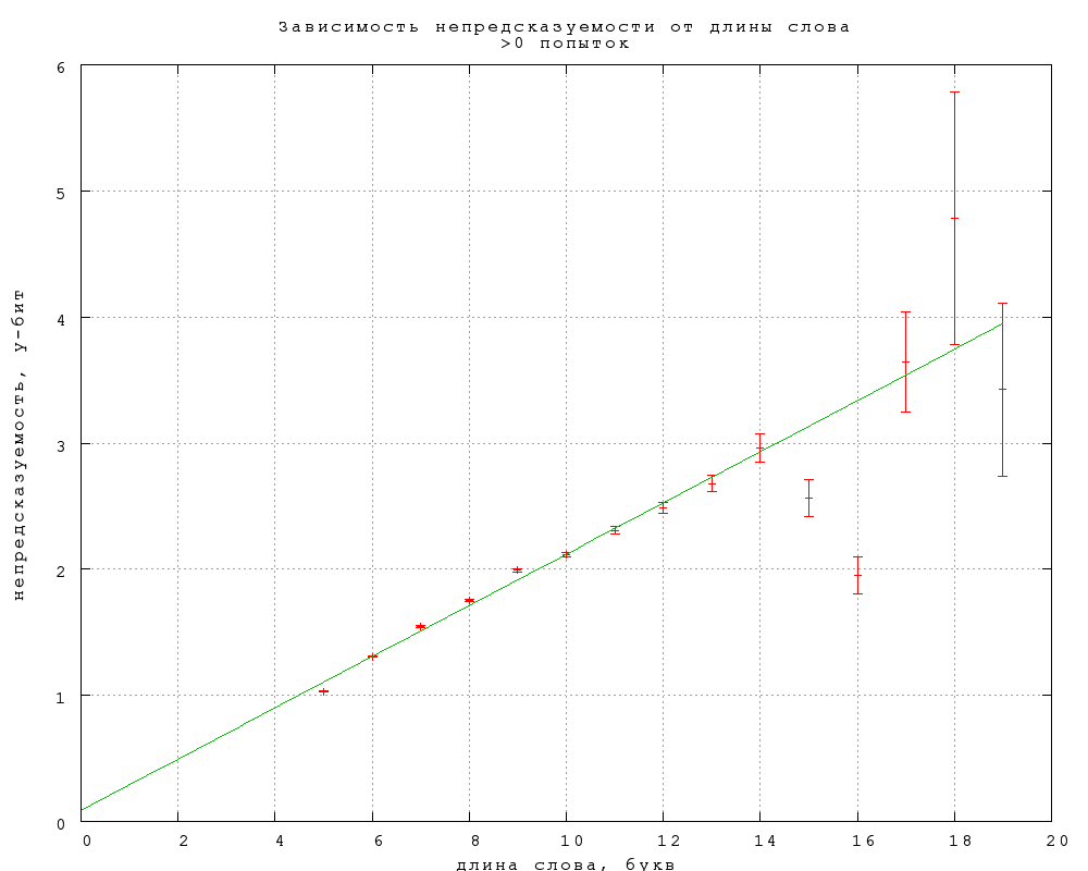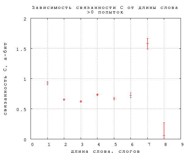 Зависимость непредсказуемости и связанности B и C от длины слова, выраженной в буквах и слогах, приведена на фиг. 16-21. Примечателен линейный рост непредсказуемости, в полном согласии со стандартной теорией информации, в предположении о статистической независимости букв в слове. Буквально оно не справедливо, конечно, но этот линейный рост показывает, что количество (равноправных) вариантов, которое мы рассматриваем, угадывая слово, растет экспоненциально с увеличением длины слова.84) При этом наклон прямой дает информативность в 0,2 бит на букву (строго говоря, каждую следующую букву после 4-й) и 0,44 бит на слог, что приблизительно согласуется со средней длиной слога в две с небольшим буквы. Конечно, это много (в 225, т.е. 30 миллионов раз по количеству рассматриваемых вариантов) меньше 5 бит на букву для случайных наборов букв. Отметим также, что рост непредсказуемости резко насыщается для слов длиннее 4 слогов. Любопытно в будущем посмотреть, как отличаются эти результаты для прозы и стихов.Связанность же оказывается в первом приближении не зависящей от длины слова, если не считать небольшого понижения на словах средней длины, 6-7 букв или 2-3 слога. Такая принципиальная разница между связанностью и предсказуемостью требует объяснения. Возможно, она связана просто с тем, что в заданиях 2-го и 3-го типа мы выбираем из двух вариантов ответа, независимо от длины слова, но могут быть и более содержательные объяснения.