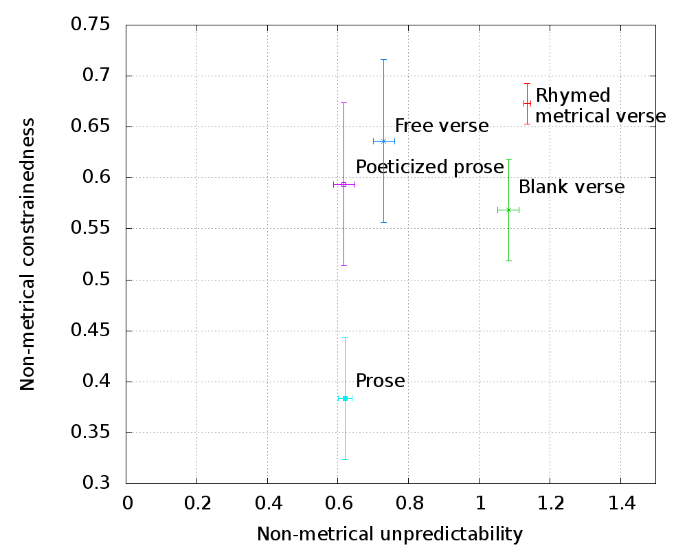 Обратимся теперь к метрическим величинам (рис. 2). Мы уже говорили, что непредсказуемость традиционной поэзии преимущественно неметрическая (т.е. семантическая и синтаксическая), и это легко видеть на рис. 2. Неудивительно также, что белый стих лежит близко к рифмованному, а верлибр и поэтизированная проза тяготеют к прозе по этому показателю. Интересно, однако, что эти два последних типа текстов кардинально отличаются от остальных по метрической связанности, которая у них отрицательна. Хотя этот результат не выходит за пределы статистической погрешности и может не подтвердиться, когда наберется больше данных, он слишком интересен, чтобы оставить его вовсе без внимания.